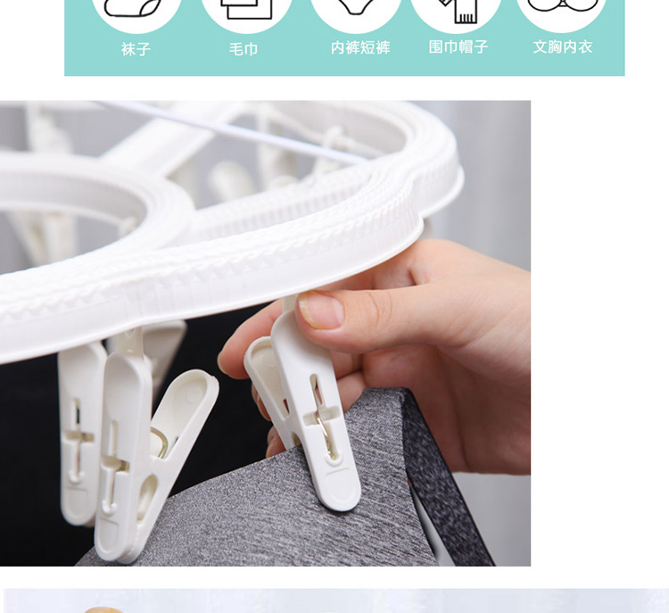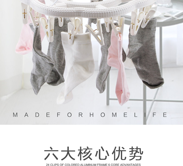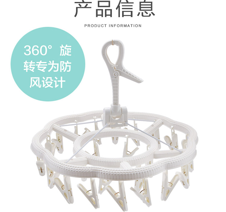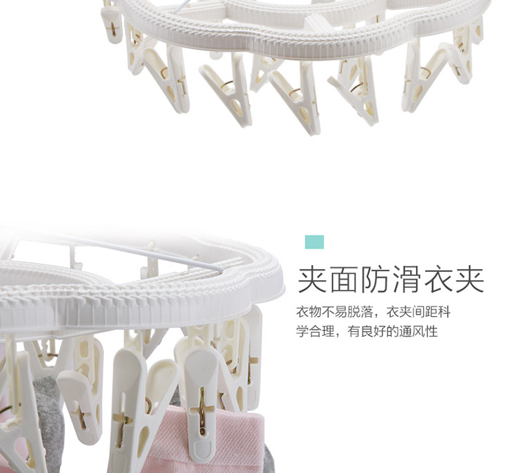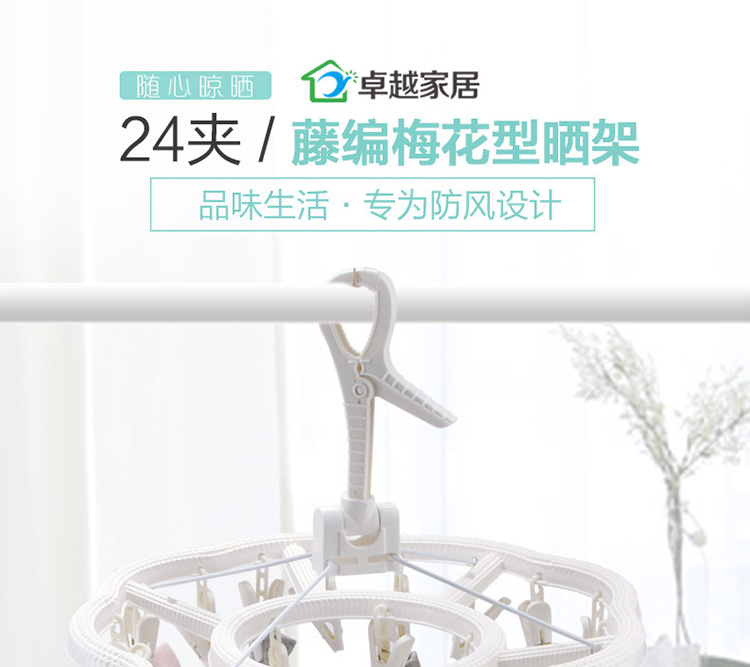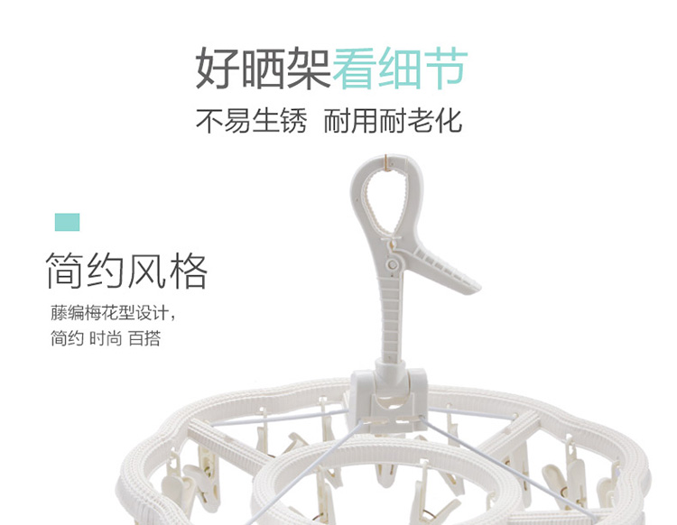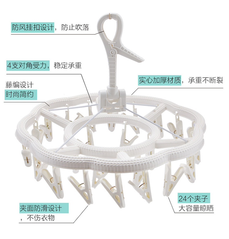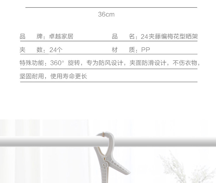 功能及卖点: 藤编时尚设计,防风挂扣设计,防止吹落;铁线4支对角受力,稳定承重,不打结;夹面防滑设计,不上衣物;24个夹子大容量。