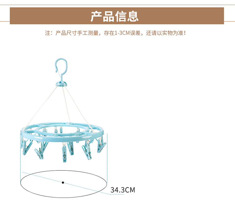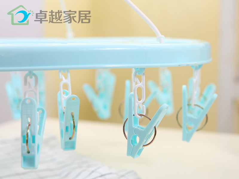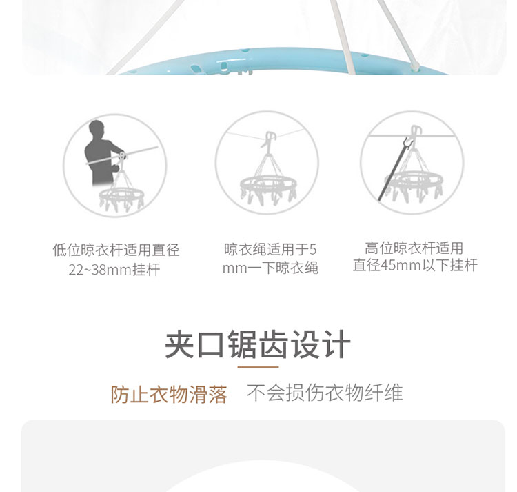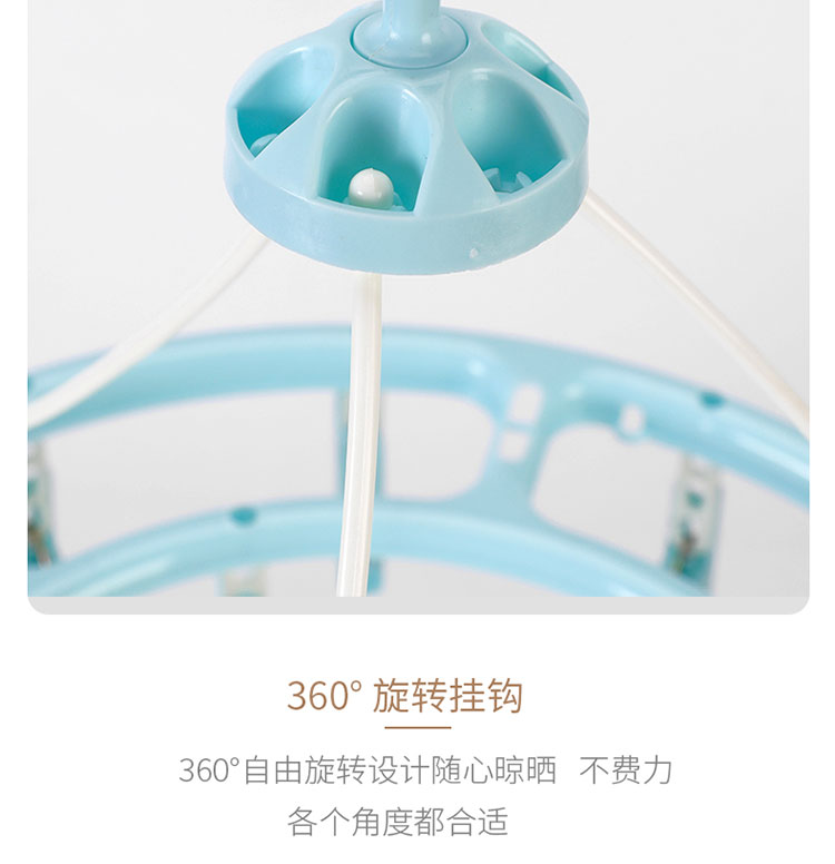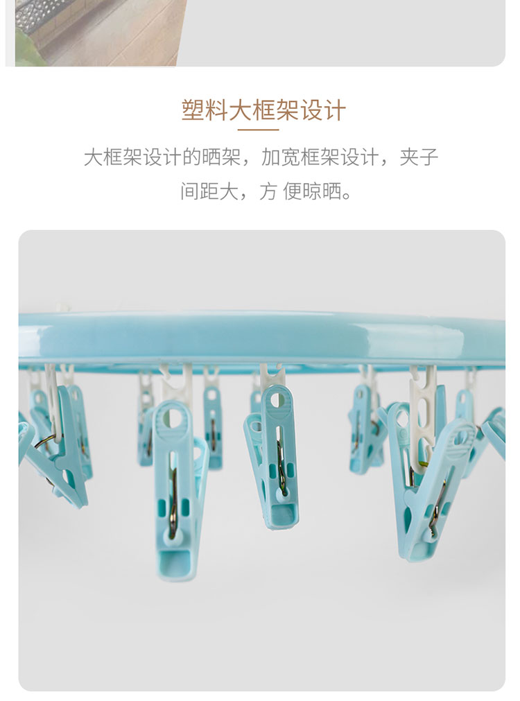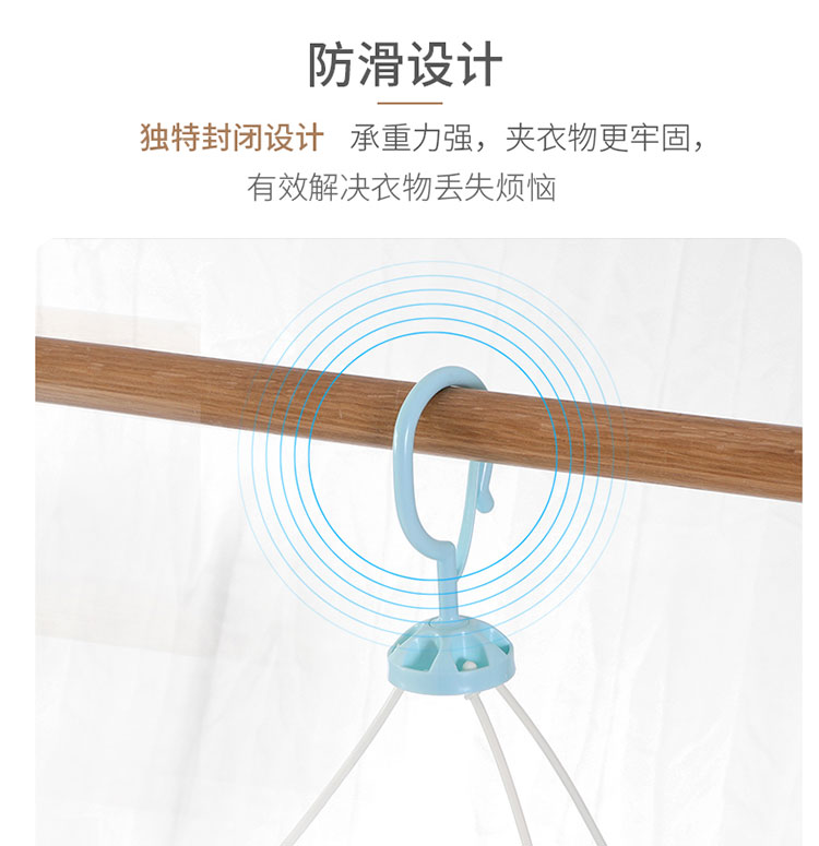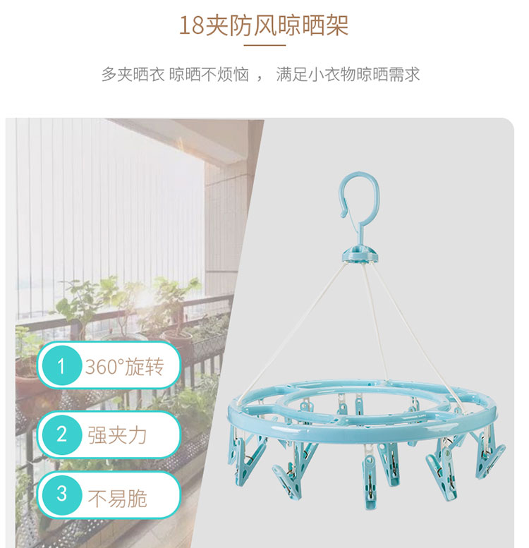 功能及卖点: 360°旋转防风挂钩,随心晾晒,不费力每一个角度都适合;多衣夹晾晒,满足小衣物晾晒需求。