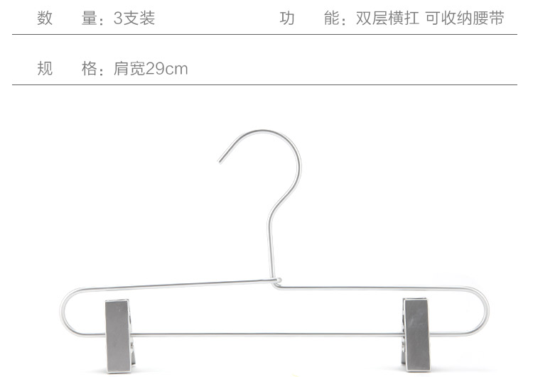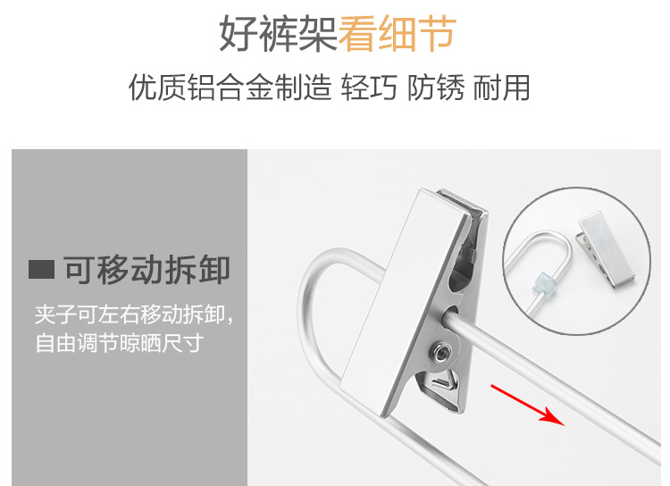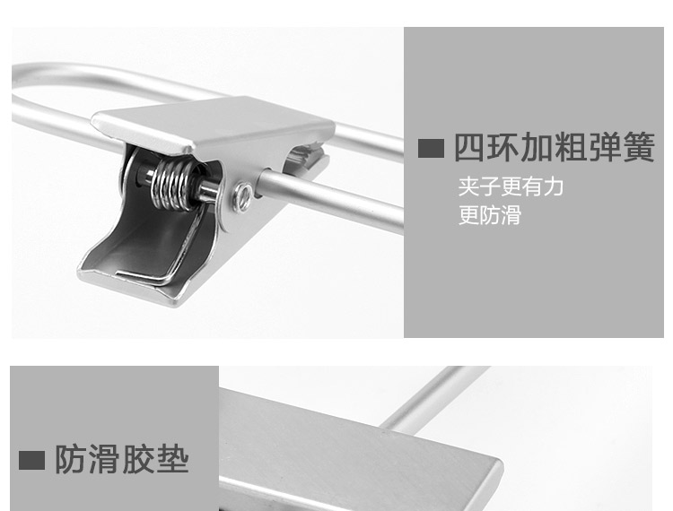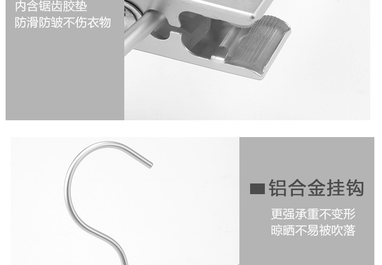 功能及卖点: 优质铝合金制造,轻巧、防锈、耐用;防滑夹子,可移动 拆卸自由调节晾晒尺寸;四环加粗弹簧,夹子更有力。