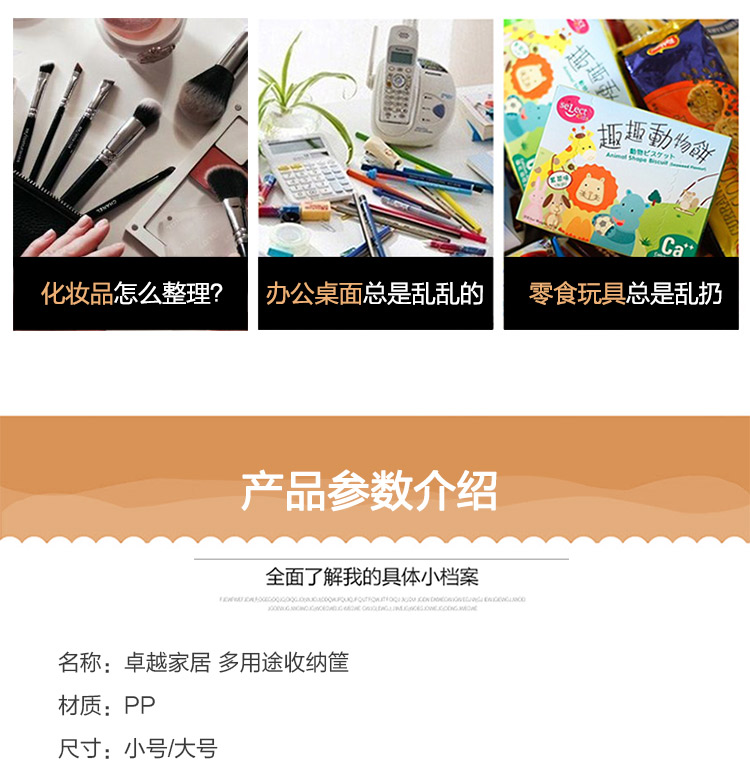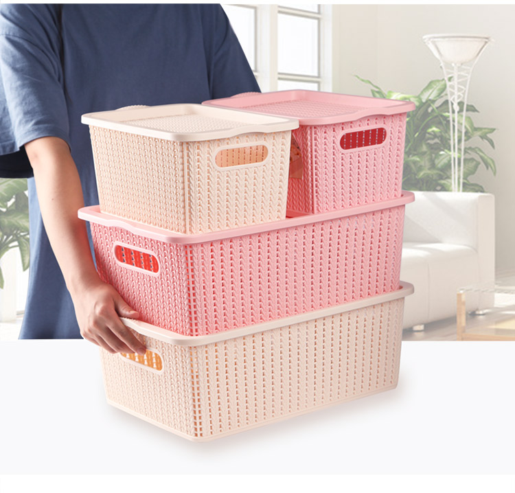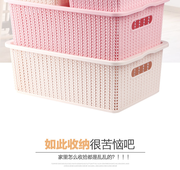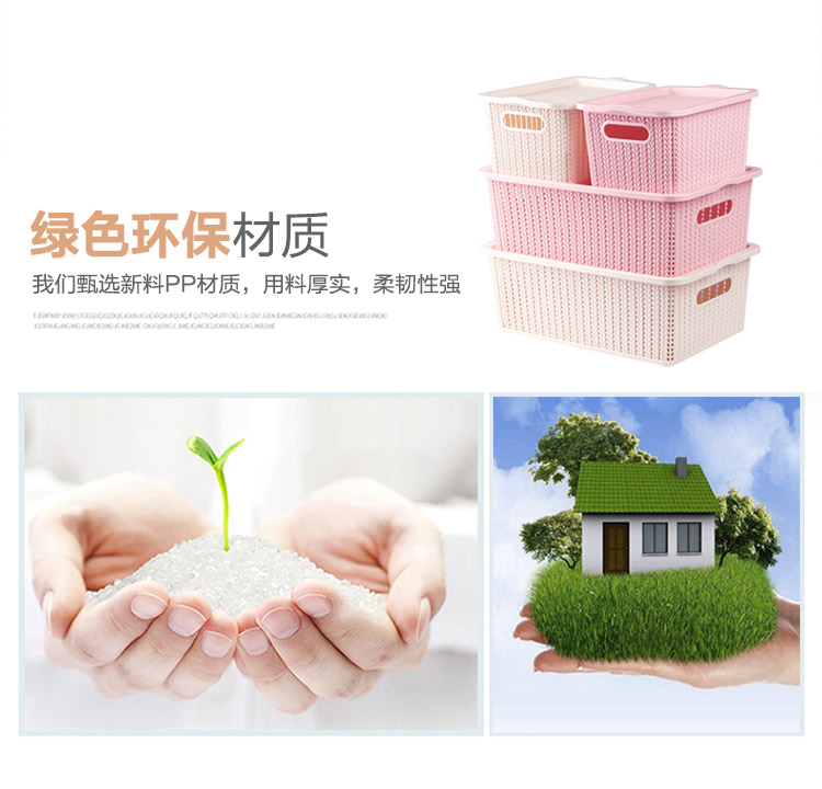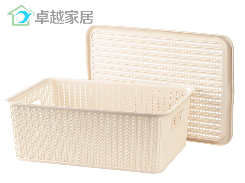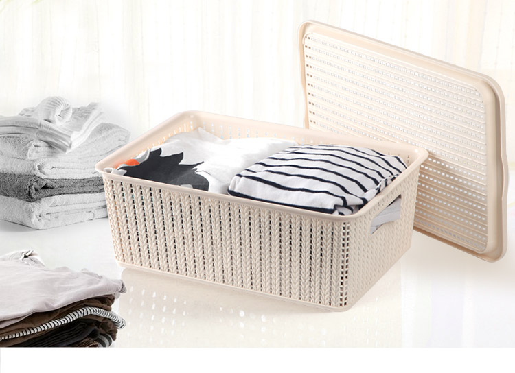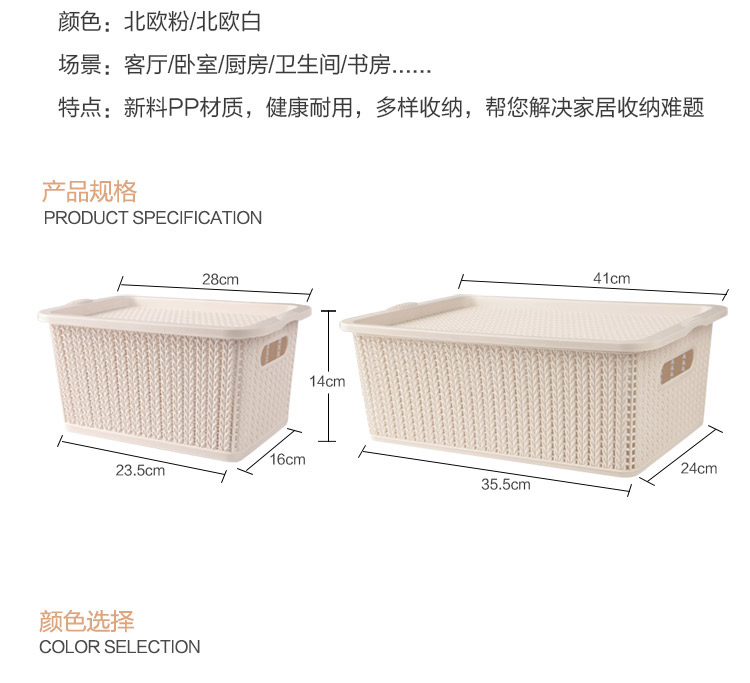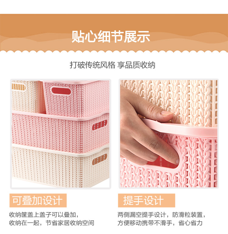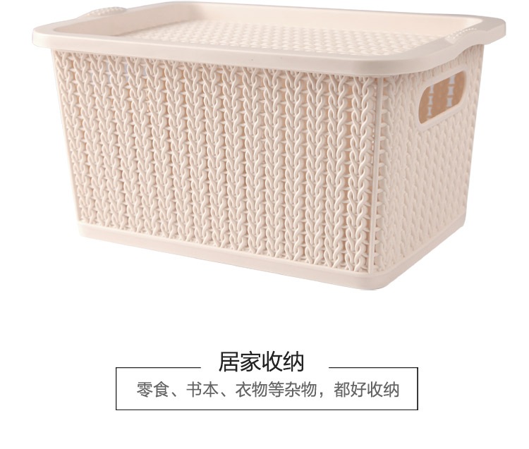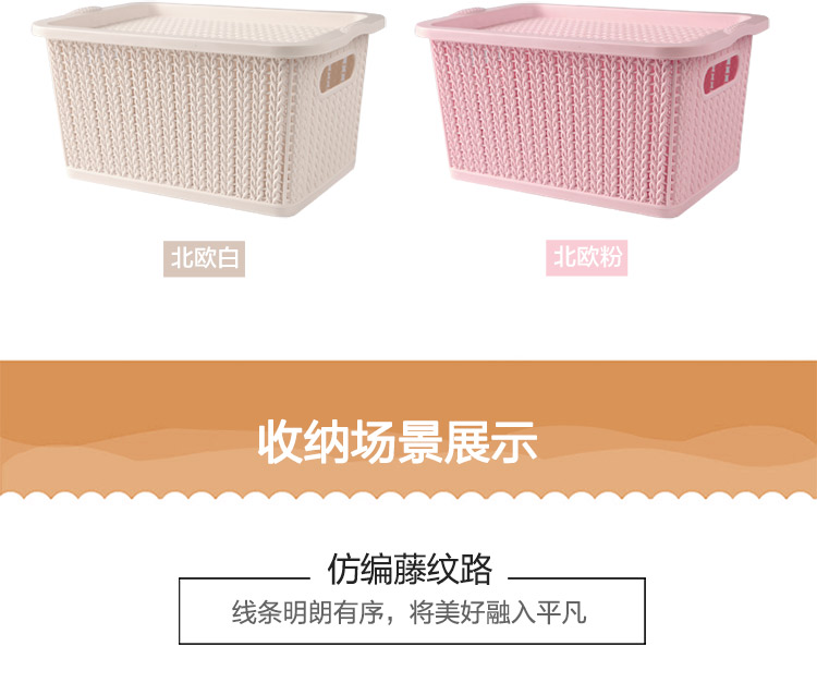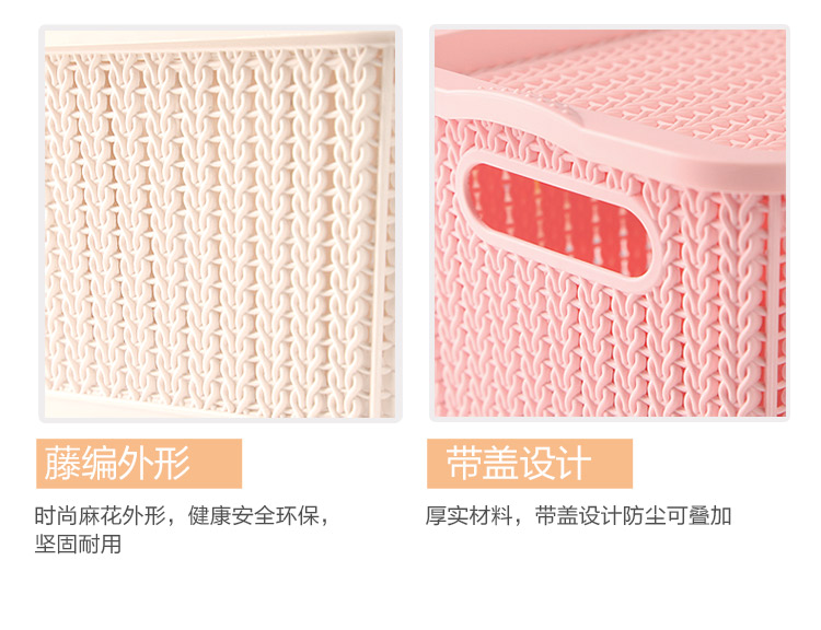 功能及卖点: 仿藤编时尚设计,带盖可叠加,收纳节省空间,整齐有序。